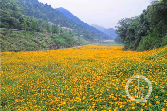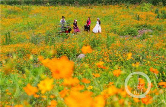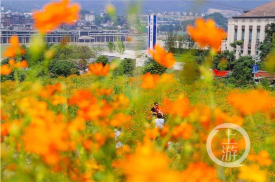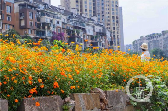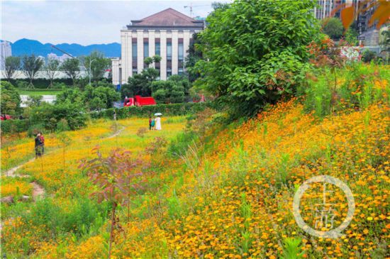 在不遠(yuǎn)處,北濱二路的三洞橋風(fēng)情街里也藏著一片金黃色的花海。在風(fēng)情街下的邊坡上,一大片硫華菊正在盛開。雖然因?yàn)榻背窍鋮^(qū)岸線環(huán)境綜合治理施工,市民無法進(jìn)入邊坡,但僅是遠(yuǎn)看已美不勝收。