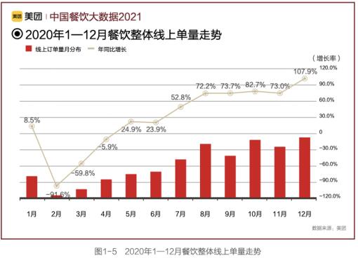 當(dāng)前,餐飲業(yè)線上線下融合發(fā)展已成大勢(shì)所趨,并對(duì)供、需兩側(cè)都產(chǎn)生重塑性影響。報(bào)告顯示,2020年5月以來(lái),餐飲整體線上訂單量快速恢復(fù)到去年同期水平,并在隨后的7個(gè)月持續(xù)爆發(fā)增長(zhǎng),至12月完成同比增長(zhǎng)107.9%。外賣(mài)平臺(tái)、小程序、餐飲平臺(tái)與品牌自建訂單協(xié)同等線上點(diǎn)單方式,進(jìn)一步打開(kāi)了餐飲品牌企業(yè)數(shù)字化發(fā)展想象力,加速向線上轉(zhuǎn)移。