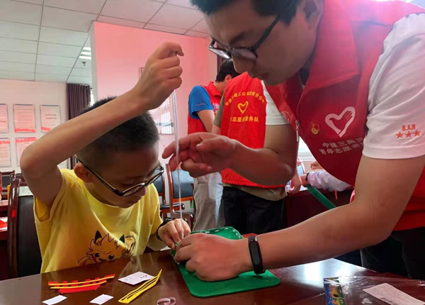 小朋友在志愿者的指導(dǎo)下縫制小挎包。彭梓鑫攝