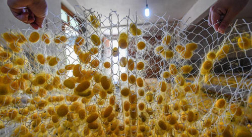 浙江省桐鄉(xiāng)市是我國重要的蠶桑產(chǎn)地之一,有著悠久的蠶桑生產(chǎn)歷史。近期,當(dāng)?shù)匦Q農(nóng)喜迎豐收季,新繭種“黃金繭”也產(chǎn)量喜人!包S金繭”色澤金黃,蠶絲呈淡金色,用其加工的蠶絲制品受到國內(nèi)外市場的青睞。