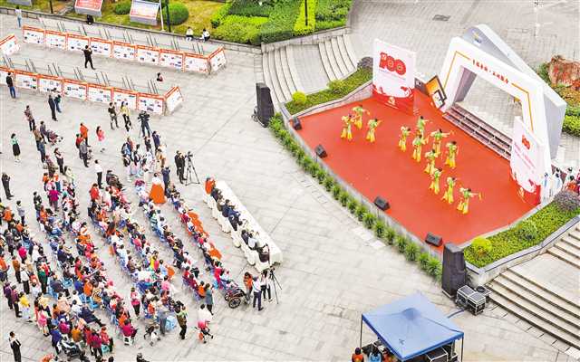 5月25日,兩江新區(qū)金山街道金渝社區(qū)居民在“百姓大舞臺”載歌載舞。當(dāng)日,當(dāng)?shù)厝罕娖谂我丫玫摹鞍傩沾笪枧_”在社區(qū)疊彩城廣場落成投用,為當(dāng)?shù)厝罕妼W(xué)習(xí)教育、文化娛樂、展示風(fēng)采提供了平臺。大舞臺投用當(dāng)天,不僅設(shè)有黨史學(xué)習(xí)教育主題展,還舉行了“百年奮斗路啟航新征程”慶祝建黨100周年文藝匯演,居民以歌舞、詩朗誦等方式頌黨恩。