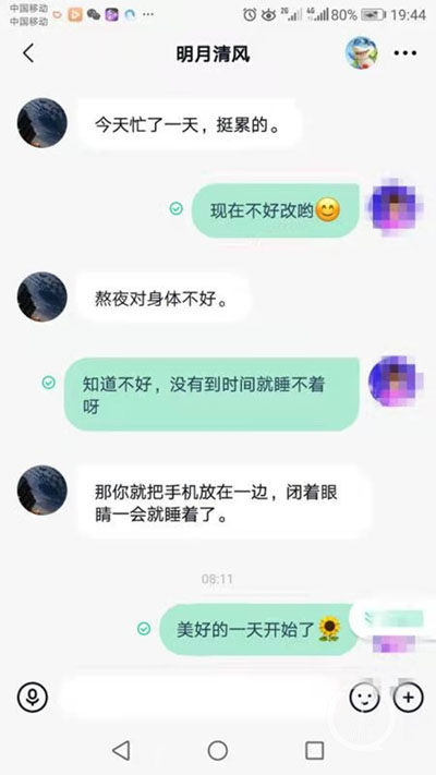 隨后的兩天時間里,張正國表現(xiàn)得非常貼心,據(jù)葉女士回憶:“早上他會問候上班累不累,中午會問候吃飯沒,晚上會問候下班沒,深夜還會提醒我睡覺。而且只要我發(fā)出信息,基本上都是很快會回復(fù),幾乎成了全天24小時的陪聊好友。”