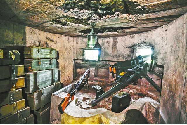 洞子呈弧形,東西走向。里面有主洞,還有支洞。在一個支洞旁,記者看到,在一個射擊臺上,立著兩挺機槍模型。槍口支到射擊口外,模仿當(dāng)年的樣子。記者目光透過射擊孔,只見視野開闊,腳下的懸崖一覽無余。交戰(zhàn)時,有人如果從崖下發(fā)起進攻,結(jié)局可想而知。
