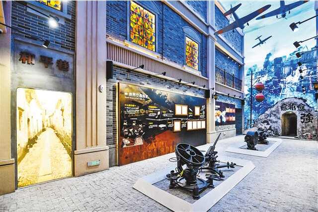 順著展廳往前,一個由頂部延伸至墻面的LED巨幕影片給人以巨大的視覺沖擊。LED巨幕上,多架轟炸機從頭頂飛過,將地面的建筑物炸得粉碎,而前方一個被炸毀的洞口上“愈炸愈強”四個字格外醒目。短片真實地還原了“從持續(xù)不斷地被轟炸,到愈炸愈強的山城人民在廢墟上站立起來場景”,將重慶人民頑強抗戰(zhàn)、不屈不撓的精神展現(xiàn)得淋漓盡致。