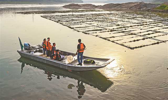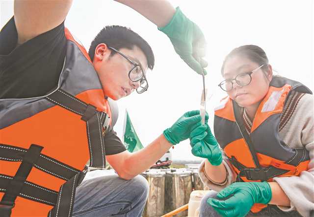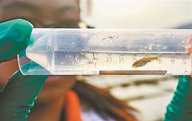 科研人員在人工魚巢查看魚類產(chǎn)卵情況。