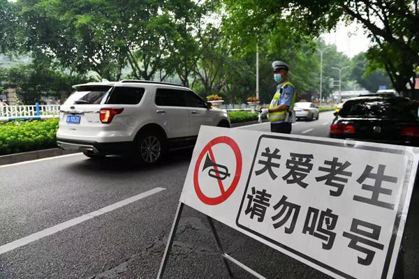 重慶一中高考考點外,交巡警設置“請勿鳴笛”提示牌,為考生營造安靜的環(huán)境。鄒樂攝
