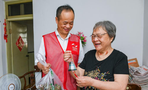 6月9日,志愿者給結(jié)對的81歲的朱春芬老人(右)送上端午節(jié)的玉米、粽子和香囊,共迎端午。