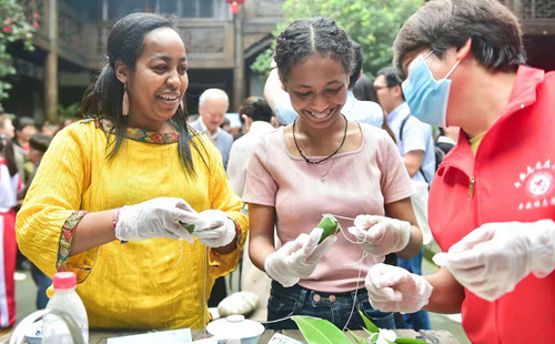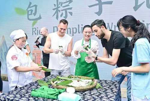 為了讓外國友人們在異鄉(xiāng)感受到家的溫暖,主辦方邀請他們一起包粽子、劃旱龍舟,以解鄉(xiāng)愁。