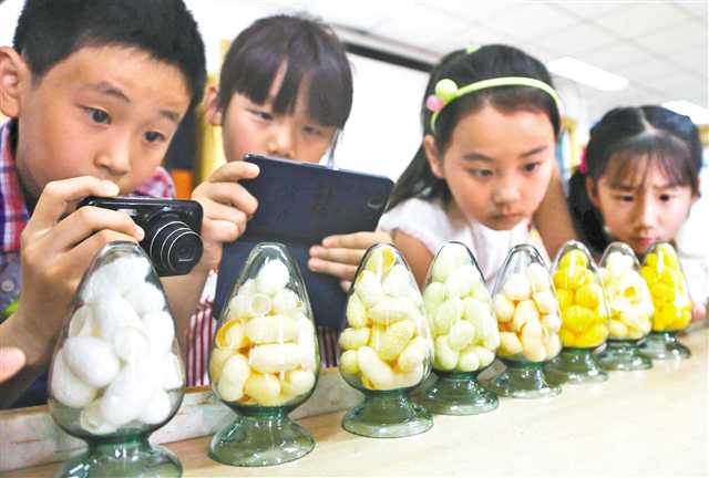小學(xué)生在西南大學(xué)家蠶基因國(guó)家重點(diǎn)實(shí)驗(yàn)室近距離觀(guān)察彩色蠶繭。(攝于2015年6月14日)特約攝影 秦廷富/視覺(jué)重慶