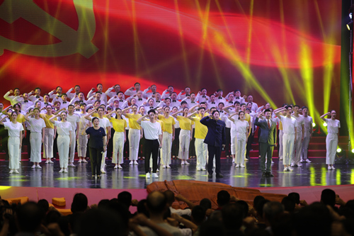 舞蹈《心中的旗幟》、群舞《春風(fēng)雨露》、音樂(lè)劇《念念不忘》、獨(dú)唱《以人民為天》等節(jié)目也陸續(xù)上演。最后,文藝演出在合唱歌舞《我宣誓》中落下帷幕,舞臺(tái)上下高唱入黨誓詞,表達(dá)永遠(yuǎn)聽(tīng)黨話,永遠(yuǎn)跟黨走的堅(jiān)定信念。(劉政寧、蔣海濤)
