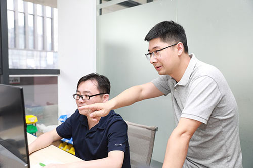 高飛與同事工作交流中。曾英豪攝