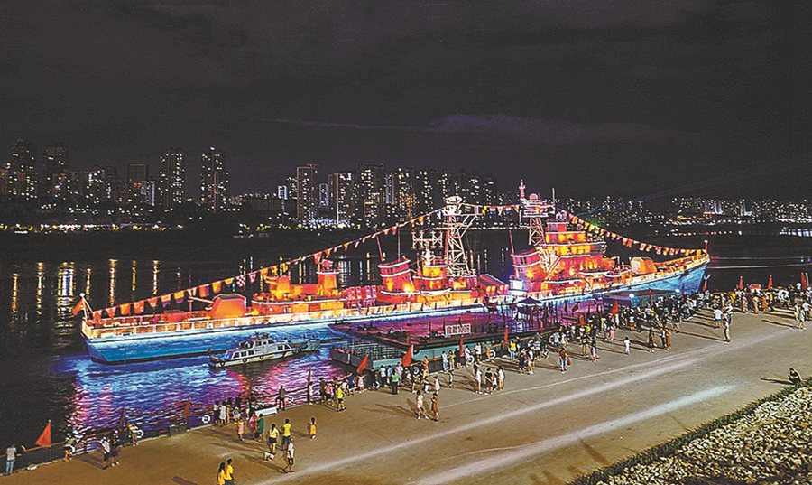 六月三十日晚,九龍坡建設(shè)碼頭,166艦燈光秀吸引了許多市民駐足欣賞。當(dāng)晚,166艦“慶祝建黨百年主題燈光秀”正式開啟。記者 鄭宇 攝\視覺(jué)重慶