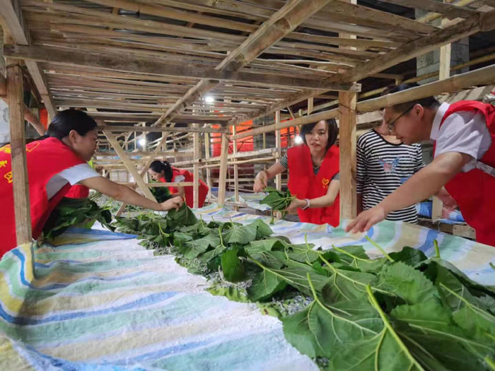 共青團(tuán)黔江區(qū)委派駐蓬勃社區(qū)駐村隊員陳濤得知脫貧戶余紹云正值養(yǎng)蠶忙碌時節(jié),勞動力較為短缺的情況,團(tuán)區(qū)委便組織了10余名青年志愿者去幫助其采摘桑葉,促進(jìn)產(chǎn)業(yè)發(fā)展。桑田里,大家齊心協(xié)力,志愿者們有的摘桑葉,有的背背簍,盡管天氣炎熱,但大家干勁十足。桑葉采摘完,大家又洗手消毒忙著給蠶寶寶投食,同時還向養(yǎng)蠶戶、駐村工作隊員請教養(yǎng)蠶技術(shù)和注意事項。
