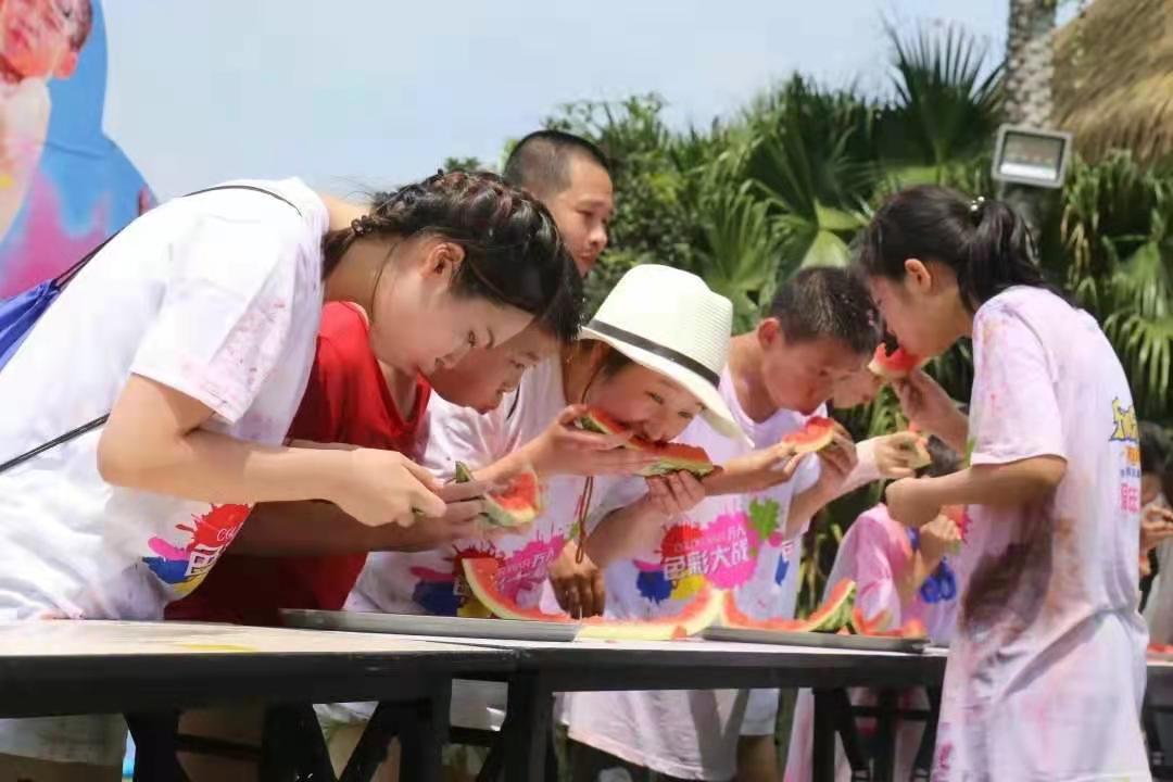 作為樂和樂都每年夏季水槍節(jié)的保留環(huán)節(jié),吃瓜比賽也吸引了許多游客參加。吃瓜大賽中,5組游客展開激烈比拼,看誰能最快吃掉面前的西瓜,F(xiàn)場(chǎng)比賽激烈,引起大批觀眾圍觀。另外,冰桶挑戰(zhàn)賽、摸魚大賽等活動(dòng)也受到游客的歡迎。