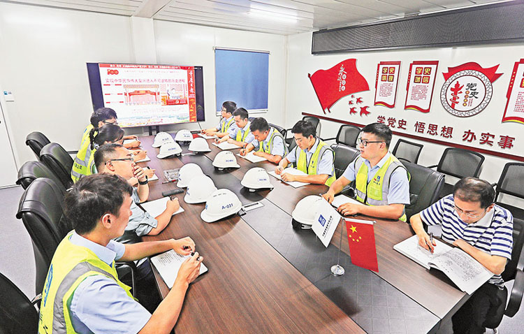 7月5日,在重慶市青少年活動(dòng)中心建設(shè)項(xiàng)目工地,市地產(chǎn)集團(tuán)所屬重慶市城市建設(shè)發(fā)展有限公司項(xiàng)目負(fù)責(zé)人組織大家學(xué)習(xí)習(xí)近平總書記在慶祝中國共產(chǎn)黨成立100周年大會(huì)上的重要講話精神。大家紛紛表示,要發(fā)揚(yáng)勞模精神,在施工一線爭當(dāng)先鋒,打造精品工程,向黨和人民交出滿意答卷。