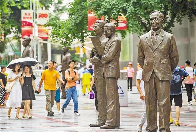 7月7日,沙坪壩區(qū)三峽廣場歷史文化名人長廊亮相。包括郭沫若、夏衍、李四光等在內的15位曾經(jīng)在沙坪壩區(qū)工作、生活過的名人的雕像,分布在廣場西側,展示了沙坪壩區(qū)深厚的文化底蘊。