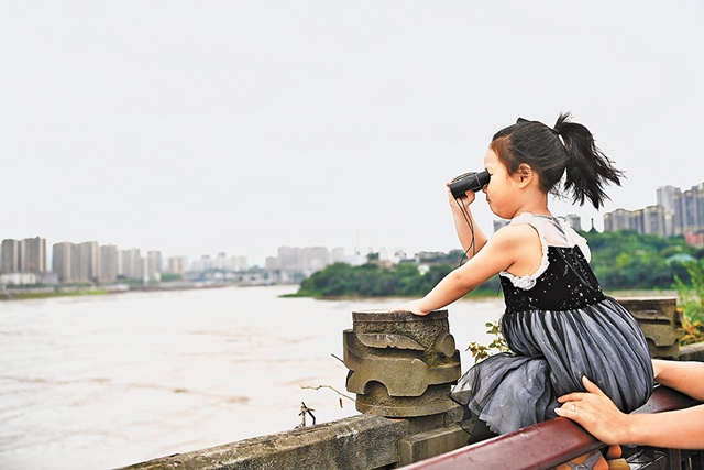 7月12日中午,“嘉陵江2021年第1號洪水”過境磁器口。圖為一位小朋友在家長的保護下手持望遠鏡“打望”不斷上漲的洪水。記者 蘇思 攝/視覺重慶