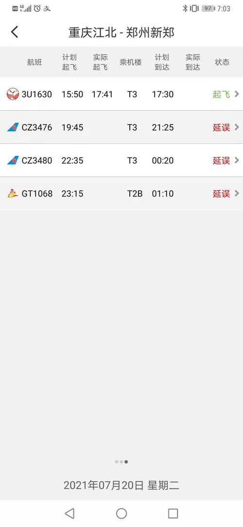 具體來看,由重慶江北飛往鄭州的CZ3476、CZ3480、GT1068均顯示延誤;由鄭州飛往重慶的CZ6649、3U1483顯示取消。(邱小雅)