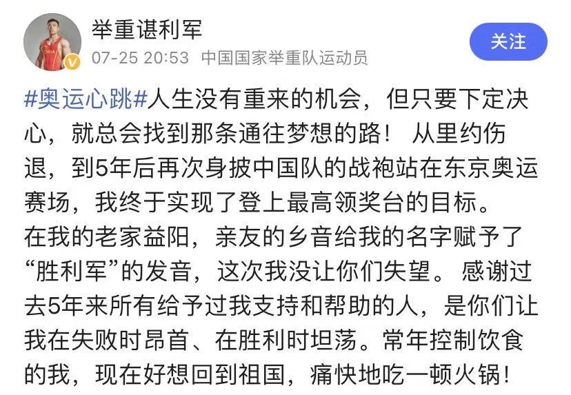 這塊金牌是諶利軍個(gè)人首塊奧運(yùn)金牌,也彌補(bǔ)了他在里約奧運(yùn)會(huì)因抽筋退賽的遺憾。賽后,諶利軍發(fā)布動(dòng)態(tài)表示,現(xiàn)在好想回到祖國(guó),痛快地吃一頓火鍋。