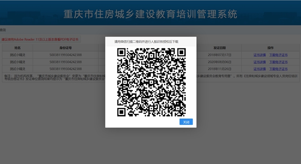 持證人員需登錄“重慶市住房城鄉(xiāng)建設(shè)教育培訓(xùn)管理系統(tǒng)”(http://jsgl.zfcxjw.cq.gov.cn:8005/cqjsgwjypx/login)點擊證書查詢,輸入姓名和身份證進入個人證書查詢界面,點擊下載電子證書,此時系統(tǒng)會彈出二維碼,持證人用手機掃碼進行人臉識別,識別成功后,持證人即可在系統(tǒng)界面下載電子證書。若連續(xù)3次識別不成功,系統(tǒng)將提示識別失敗,本人與照片不符,持證人員可申請修改相關(guān)信息。