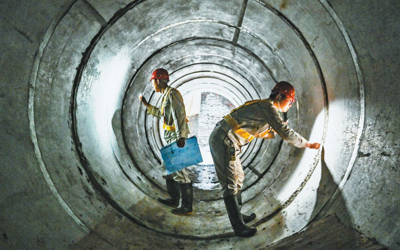 7月26日,西部(重慶)科學(xué)城,110千伏學(xué)山南北線三標(biāo)段施工現(xiàn)場(chǎng),工作人員正在檢查隧道壁。