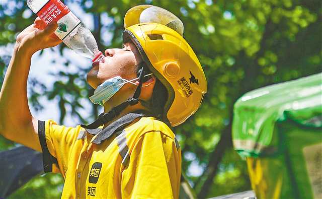 8月2日,接單送餐的外賣小哥正在喝水。首席記者 龍帆 攝/視覺重慶