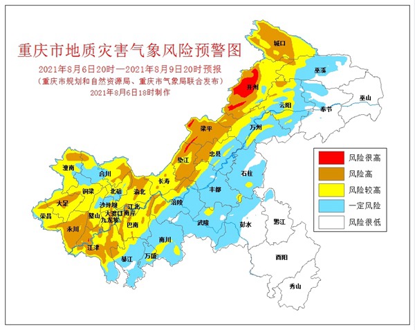 8月8日20時至8月9日20時,萬州區(qū)、云陽縣、開州區(qū)、梁平區(qū)、巫溪縣、石柱縣屬于風險很高地區(qū),地質災害氣象風險等級為一級(紅色預警),潼南區(qū)、江津區(qū)、綦江區(qū)、萬盛區(qū)、豐都縣、彭水縣、涪陵區(qū)、黔江區(qū)、武隆區(qū)、忠縣、奉節(jié)縣、巫山縣屬于高風險地區(qū),地質災害氣象風險等級為二級(橙色預警),合川區(qū)、南川區(qū)、墊江縣、城口縣屬于風險較高地區(qū),地質災害氣象風險等級為三級(黃色預警),銅梁區(qū)、渝北區(qū)、北碚區(qū)、長壽區(qū)、江北區(qū)、巴南區(qū)、南岸區(qū)、兩江新區(qū)、酉陽縣屬于一定風險地區(qū),地質災害氣象風險等級為四級(藍色預警),請相關區(qū)縣和當?shù)鼐用褡⒁夥婪。(胡虹、劉敏?/p>