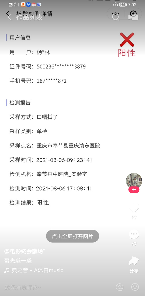 經(jīng)查實(shí),違法行為人楊某林(男,19歲,奉節(jié)縣朱衣鎮(zhèn)人,有多次盜竊前科)為博人眼球,于8月8日通過手機(jī)自帶編輯軟件將核酸檢測(cè)“陰性”結(jié)果修改為“陽性”,并通過網(wǎng)絡(luò)平臺(tái)散布傳播,引發(fā)公眾恐慌,造成不良影響。