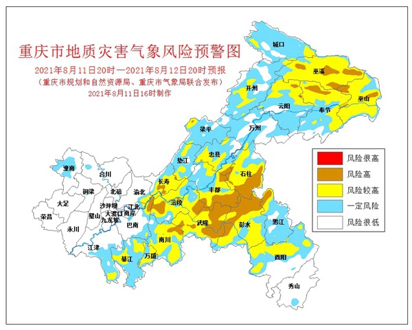 8月11日20時至8月12日20時,梁平區(qū)、涪陵區(qū)、長壽區(qū)、墊江縣、豐都縣、石柱縣、忠縣、彭水縣、武隆區(qū)、黔江區(qū)、南川區(qū)、巴南區(qū)、云陽縣、巫溪縣、奉節(jié)縣、巫山縣屬于高風(fēng)險地區(qū),地質(zhì)災(zāi)害氣象風(fēng)險等級為二級(橙色預(yù)警),城口縣、開州區(qū)、萬州區(qū)、酉陽縣、江津區(qū)、綦江區(qū)、萬盛區(qū)、渝北區(qū)、江北區(qū)屬于風(fēng)險較高地區(qū),地質(zhì)災(zāi)害氣象風(fēng)險等級為三級(黃色預(yù)警),潼南區(qū)、合川區(qū)、秀山縣、南岸區(qū)、銅梁區(qū)屬于一定風(fēng)險地區(qū),地質(zhì)災(zāi)害氣象風(fēng)險等級為四級(藍色預(yù)警),請相關(guān)區(qū)縣和當(dāng)?shù)鼐用褡⒁夥婪。(胡虹、劉敏?/p>