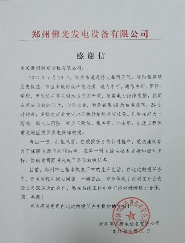 人民網(wǎng)重慶8月18日電 近日,重慶康明斯收到一封來自河南鄭州一企業(yè)的感謝信,對公司第一時間提供技術(shù)支持和配件支持、主動履行社會責(zé)任、以實際行動全力支持抗洪救援表示感謝。