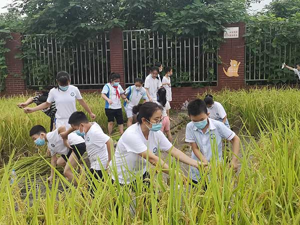 學(xué)生在教師指導(dǎo)下割谷子 江津區(qū)教委供圖