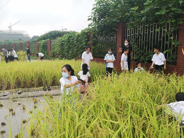 正在割谷子的學(xué)生驚喜發(fā)現(xiàn)稻田里的魚 江津區(qū)教委供圖