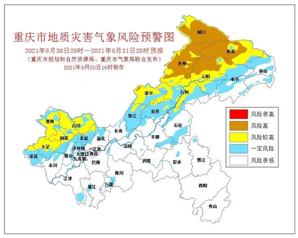 人民網(wǎng)重慶8月30日電 8月30日16時,重慶市規(guī)劃和自然資源局、重慶市氣象局聯(lián)合發(fā)布全市地質(zhì)災(zāi)害氣象風(fēng)險預(yù)警。