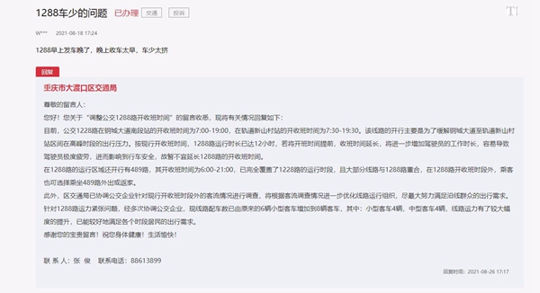 針對網友的留言,大渡口區(qū)交通部門及時做出了調整,并給網友回復:1288路運行時長已達12小時,若將開班時間提前,收班時間延長,將進一步增加駕駛員的工作時長,容易導致駕駛員極度疲勞,進而影響到行車安全,故暫不宜延長1288路的開收班時間。區(qū)交通局已協(xié)調公交企業(yè)針對現(xiàn)行開收班時段外的客流情況進行調查,針對1288路運力緊張問題,經多次協(xié)調公交企業(yè),現(xiàn)線路配車數(shù)已由原來的6輛小型客車增加到8輛客車。