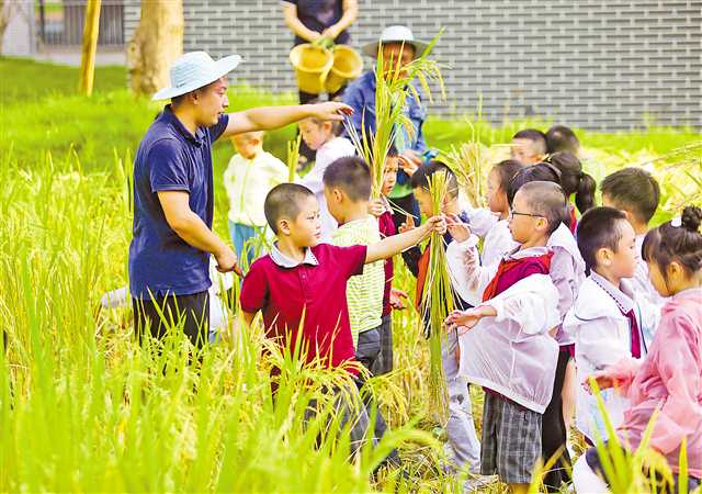 9月2日,兩江新區(qū)童心青禾小學(xué)全校594名小學(xué)生上了一堂特殊的勞動課——校園里,師生們共同種植的稻子成熟了,孩子們興奮地和老師一起下田收稻谷、撻谷子,感受什么叫粒粒皆辛苦。