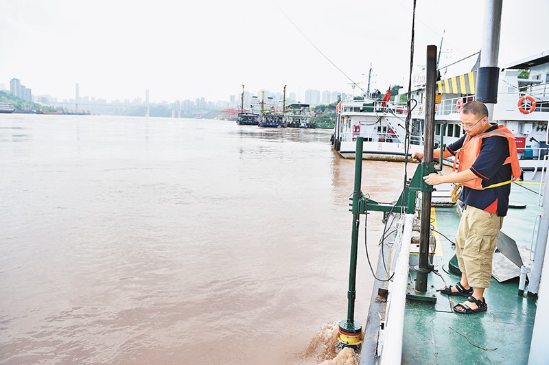 9月7日,長江上游水文水資源勘測局工作人員在對(duì)長江寸灘段流量進(jìn)行測量。新華社發(fā)