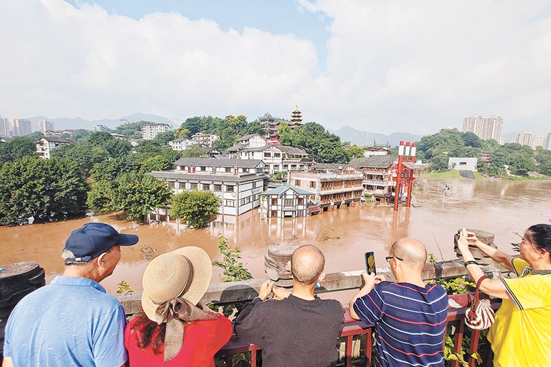 9月7日,沙坪壩區(qū)磁器口,市民觀看嘉陵江2號(hào)洪水通過主城。記者 崔力 攝/視覺重慶