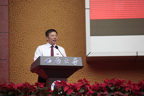 西南大學(xué)校長(zhǎng)張衛(wèi)國用孟子的“得天下英才而教育之,三樂也”表達(dá)對(duì)迎來新同學(xué)的喜悅。他勉勵(lì)大家:今天來到西大,只是圓了人生的一個(gè)夢(mèng)想,未來的西大將為每一個(gè)有夢(mèng)想的學(xué)子提供更廣闊的發(fā)展空間。優(yōu)秀的學(xué)子們一定能像今年東京奧運(yùn)會(huì)上勇摘三金一銀一銅的師姐師兄:施廷懋、諶利軍、廖秋云、趙帥一樣,在西南大學(xué)充分施展才華,放飛絢爛多彩的夢(mèng)想。 隨后,他以“不負(fù)時(shí)代、不負(fù)韶華、不負(fù)期望”為題寄語新生。希望新生們一定要牢記三個(gè)“不負(fù)”,認(rèn)知時(shí)代主題、把握時(shí)代際遇,在自己所處的時(shí)代下謀劃人生是同學(xué)們成長(zhǎng)成才的前提。希望同學(xué)們著眼時(shí)代賦予的重任,養(yǎng)浩然之氣,擔(dān)時(shí)代之責(zé);隨著知識(shí)更新不斷加快、社會(huì)分工日益細(xì)化、新技術(shù)新模式層出不窮,同學(xué)們要沉得下心境、耐得住性情,要求知若渴、虛心若愚,努力掌握科學(xué)文化知識(shí)和專業(yè)技能,使自己的知識(shí)視野、思想觀念、認(rèn)知水平跟上時(shí)代發(fā)展的步伐;要立大志、明大德、成大才、擔(dān)大任,求得真學(xué)問,練就真本領(lǐng),用聰明才智服務(wù)人民,用開拓進(jìn)取回報(bào)國家,成為可堪大用、能擔(dān)重任的棟梁之材。(胡虹、袁杰)