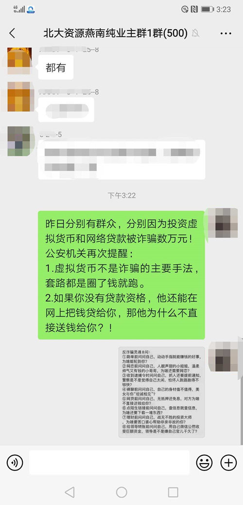 “事實上,很多電信詐騙都是發(fā)生在微信群中,比如刷單群、投資群!本琵埮沙鏊彼L馮牧介紹,“既然潛在受害人都是喜歡玩微信群聊的人,那么我們的宣防陣地也應(yīng)該轉(zhuǎn)移到線上,各個小區(qū)業(yè)主群的群主都是小區(qū)的‘名人’,也時刻關(guān)注著群消息,他們的號召力和活躍度正是我們可以借助的力量!