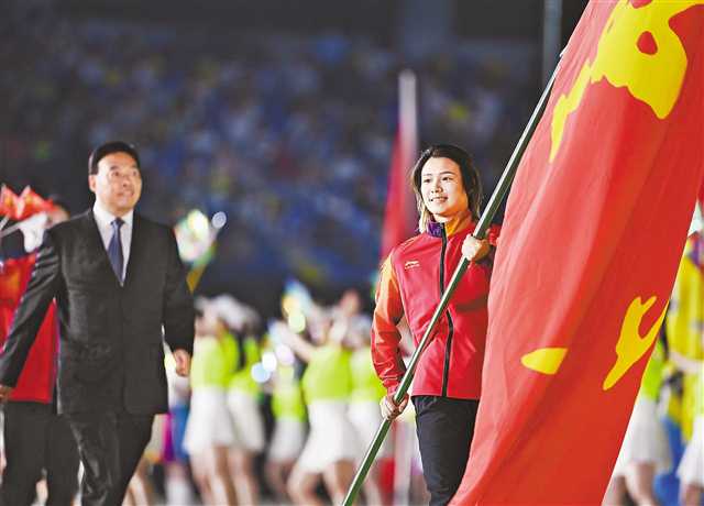 9月15日,重慶市體育代表團(tuán)旗手施廷懋在入場儀式上。新華社發(fā)