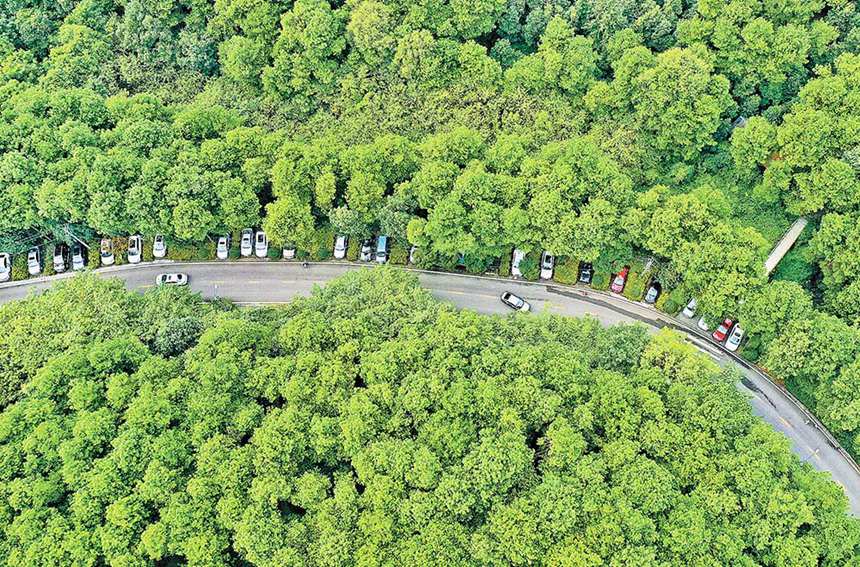 9月12日,江北區(qū)鐵山坪森林公園,前來游玩的市民將汽車停在林間的生態(tài)停車位上。