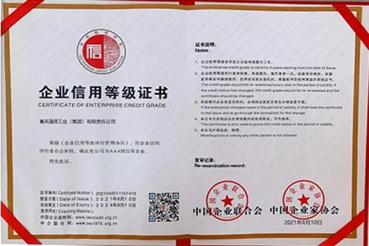 人民網(wǎng)重慶9月17日電 近日,中國企業(yè)聯(lián)合會(huì)、中國企業(yè)家協(xié)會(huì)發(fā)布2021年第一批信用企業(yè)名單,機(jī)電集團(tuán)所屬重通集團(tuán)成功上榜,被授予“AAA級(jí)信用企業(yè)”稱號(hào)。