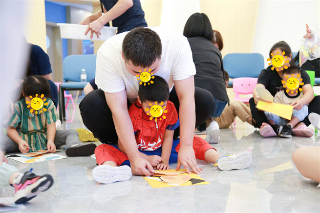 “小蜘蛛俠”和爸爸正在用心構(gòu)思自己的作品。院方供圖