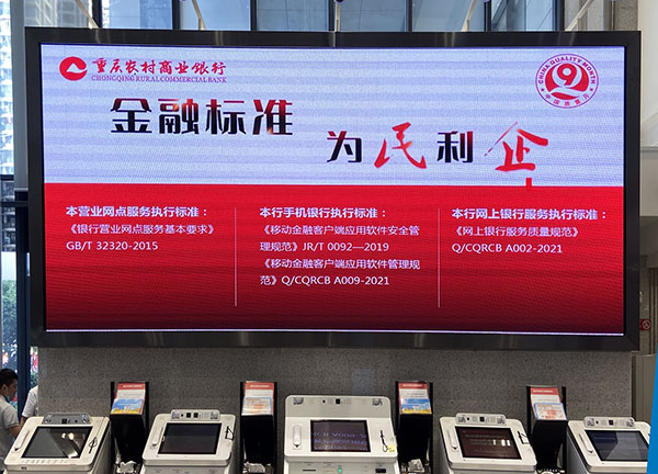 重慶農(nóng)商行江北支行營業(yè)部通過液晶顯示屏開展“金融標(biāo)準(zhǔn) 為民利企”主題宣傳。重慶農(nóng)商行供圖