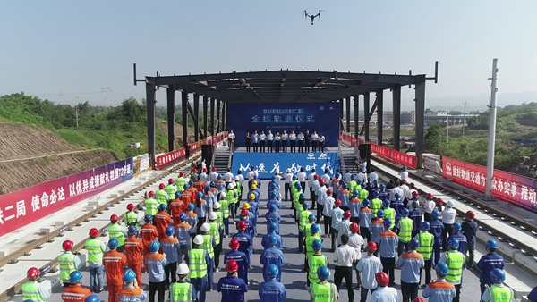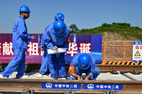 現(xiàn)場安裝最后一節(jié)25米鋼軌。中鐵二局供圖
