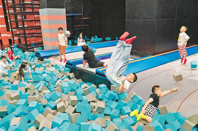 10月2日,兩江新區(qū)一奧天地,孩子們?cè)诖笮捅拇补珗@JUMP 360內(nèi)玩耍。記者 崔力 攝/視覺(jué)重慶