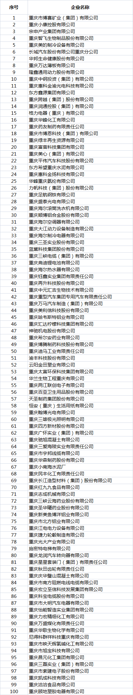 2021重慶民營企業(yè)制造業(yè)100強榜單