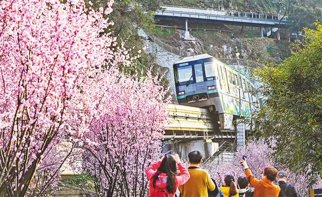 2月19日,重慶軌道交通2號(hào)線佛圖關(guān)、一號(hào)橋、兩路口、黃花園大橋北等地段花開(kāi)正艷。首席記者 龍帆 攝/視覺(jué)重慶