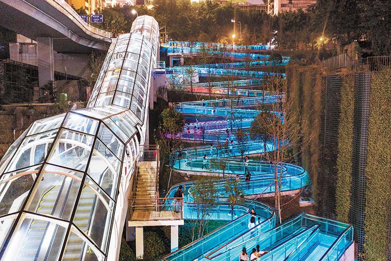 10月9日晚,渝中區(qū)東水門大橋北橋頭,無(wú)障礙景觀步道燈飾扮靚江岸。景觀步道連接陜西路和長(zhǎng)濱路,已于國(guó)慶節(jié)前夕投用,市民通過(guò)步道可以快速到達(dá)湖廣會(huì)館。步道兩側(cè)和崖壁都栽種了不少植物,形成了一處極具山城特色的坡坎崖景觀。