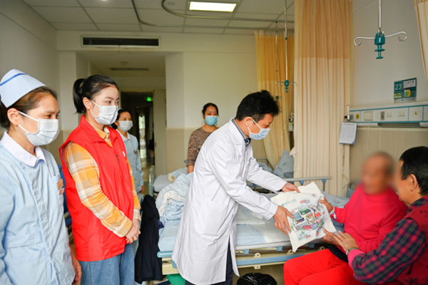 醫(yī)院黨委書記廖肇州為患者送上禮品。重慶市第十三人民醫(yī)院(重慶市老年病醫(yī)院)供圖